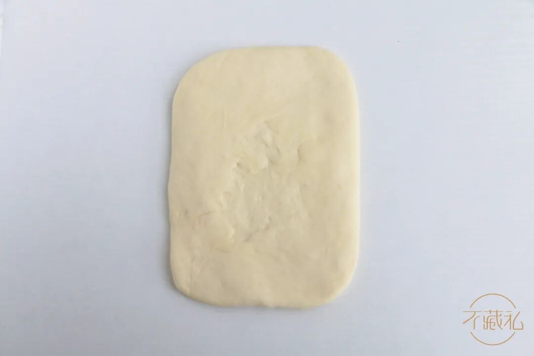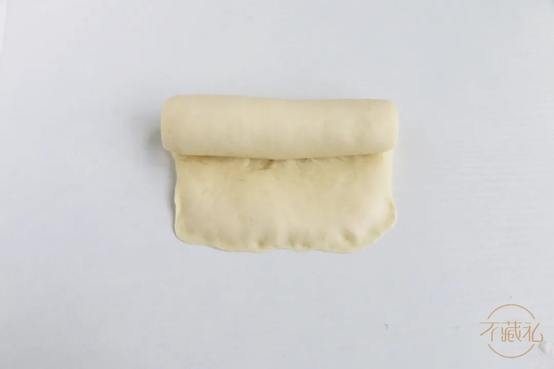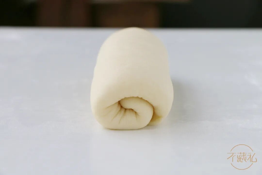 9.面团按步骤整形成长条状:①轻拍排气→②擀长(宽度约10-13cm)→③翻面后卷起(尾部按薄便于收口)→④收口处收紧朝下放。