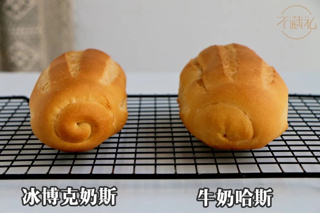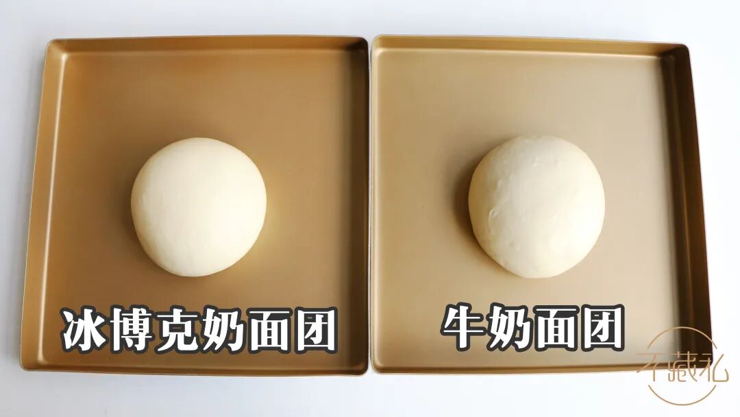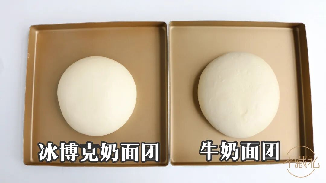 ●在相同发酵时间下,冰博克面团比普通牛奶面团小一点,如果想发到普通牛奶哈斯相同的状态,可以适当延长发酵时间。