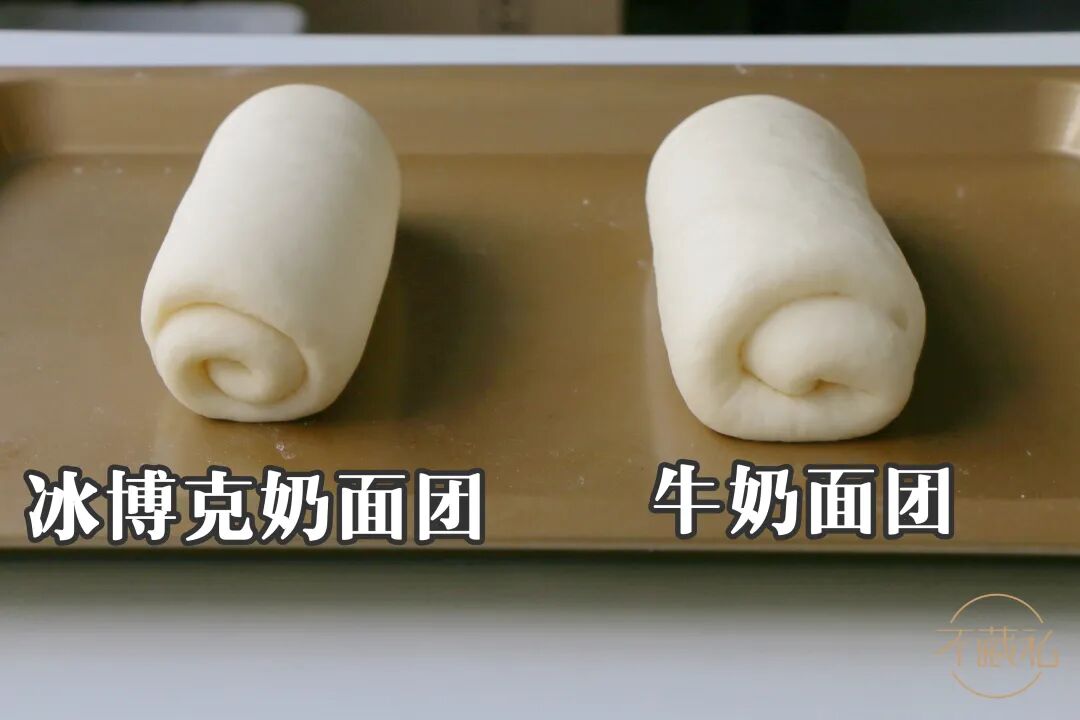●刚揉好的冰博克面团弹性比较强,摸上去不会粘手,软硬度比较适中;普通牛奶面团比较软,弹性中等,摸上去会稍稍有点粘手。