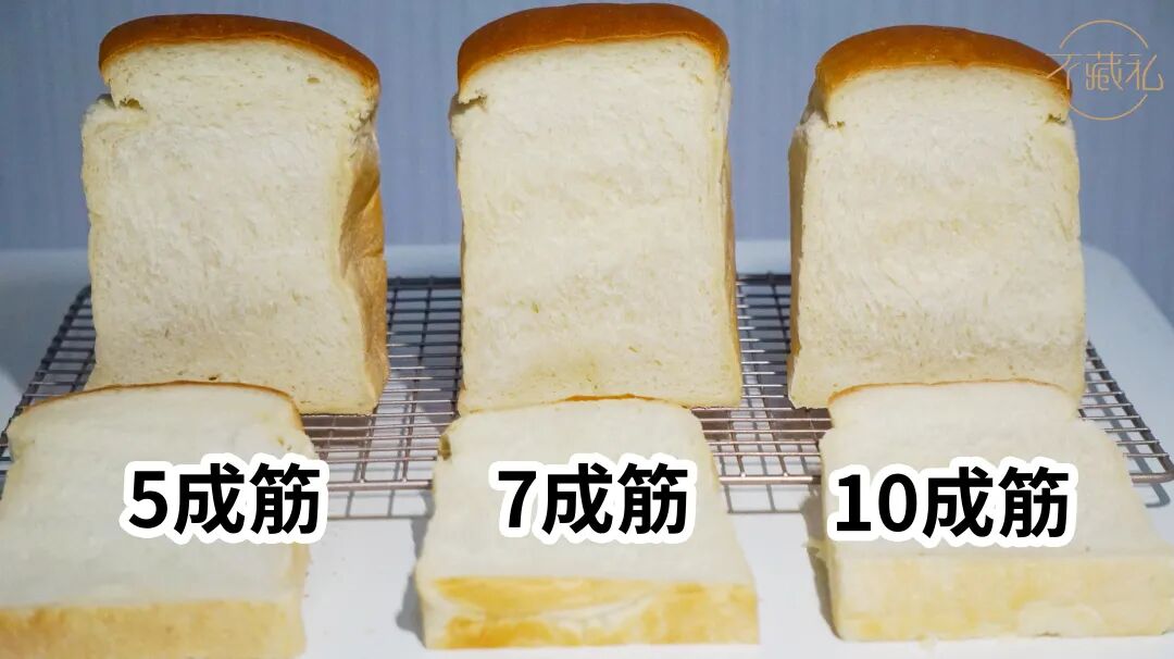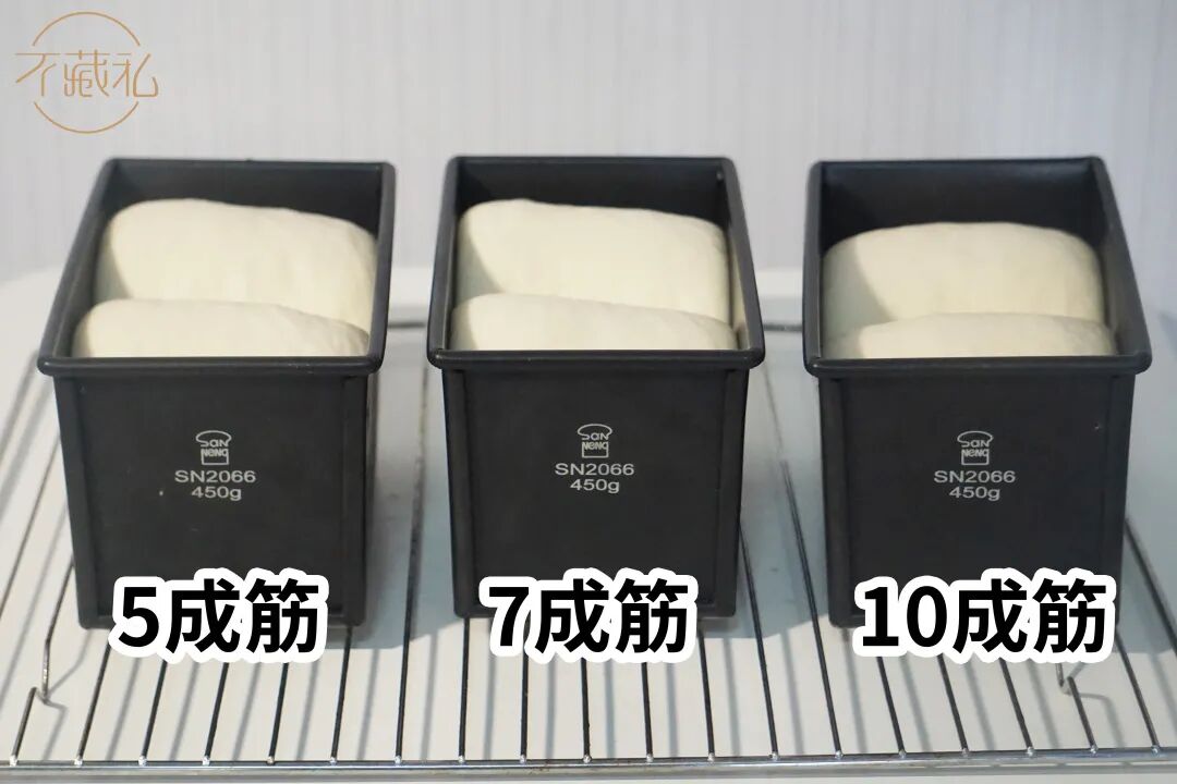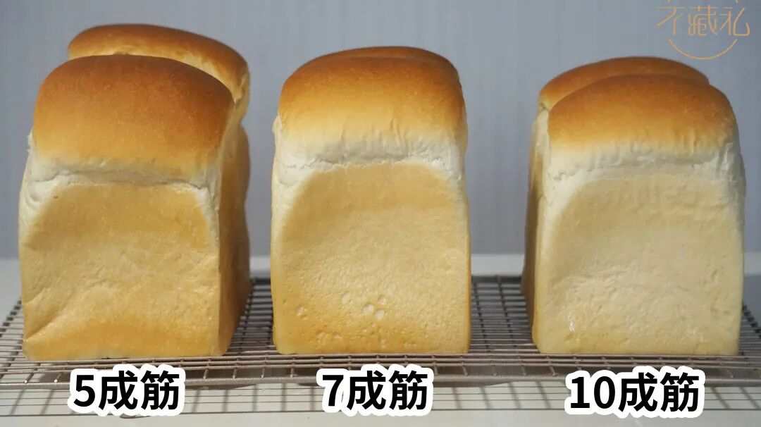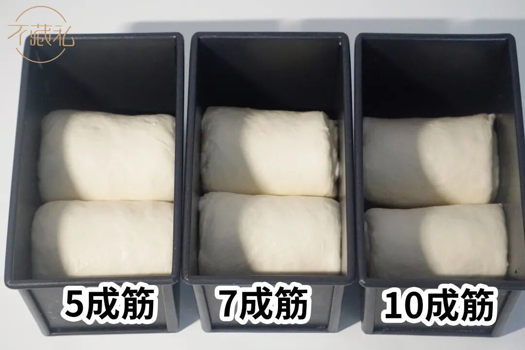 ② 5成筋的吐司是有明显歪头,侧爆的问题。而10成筋无论是口感、柔软度、组织等都是最好的,所以揉出到位“手套膜”(延展性与弹性必须平衡好那种)面团是有必要的。