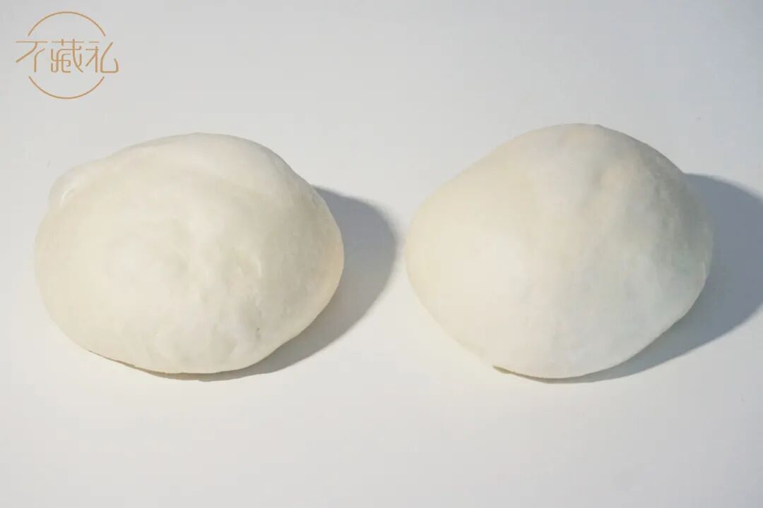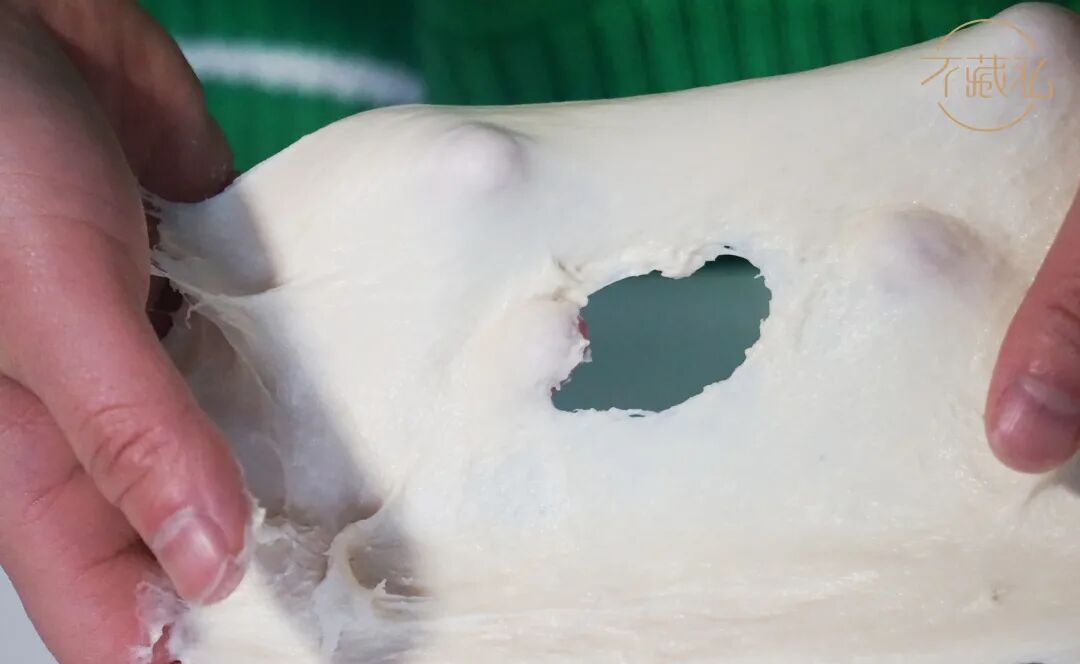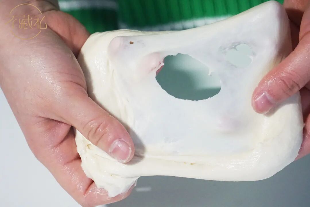 面团光滑细腻,用手拉伸可轻松扯出长面皮,面皮侧边不容易断裂且不会下垂,抻出的薄膜可见指纹,破口处无锯齿,可以轻松滚成光滑细腻的面团。