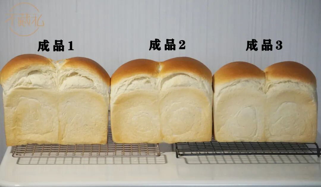 *制作都使用了鲜酵母,膨胀力大,面团筋度足,发到7.5成拿去烤也能有相当可以的成品,为了试验的真实性和公平性,3个吐司同时入炉烘烤。如平时用干酵母制作,面团则需发酵到8.5分满才拿去烤,要不然只能烤出小矮子。