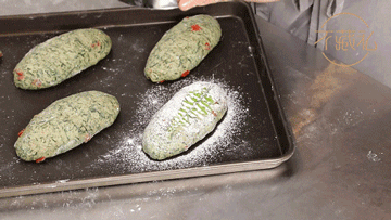 欧包表面的装饰可以由撒粉和割包两个环节组成。撒粉可以简单地铺满,也可以用纸板剪出图案,放在面包上再撒粉。撒粉后用利刃割包,是割,不是切,要避免刀口不快。