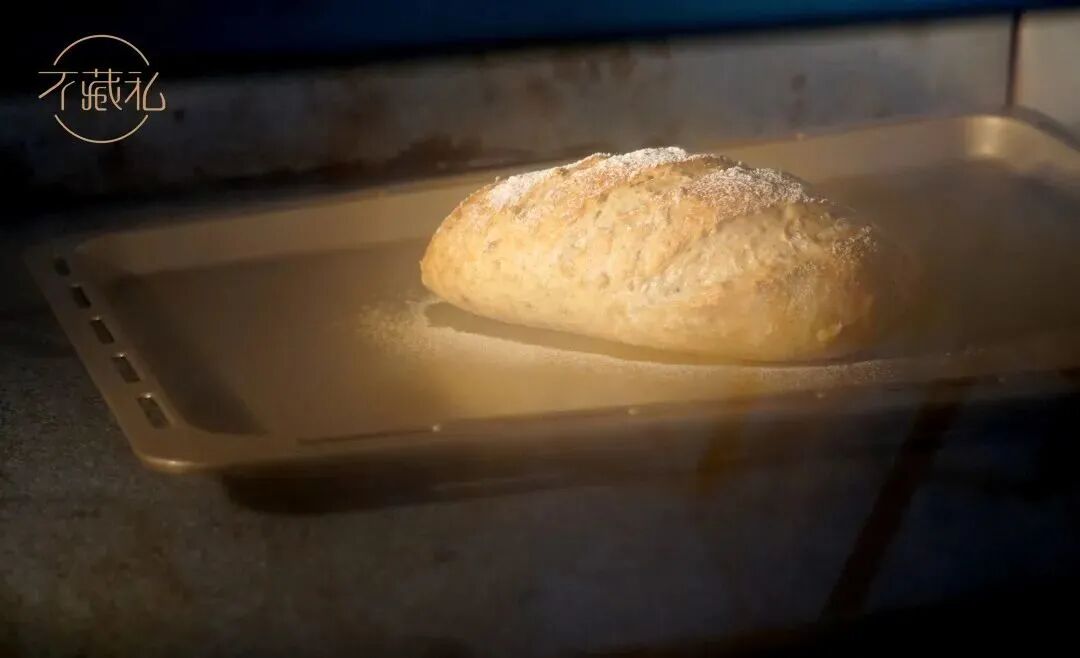 面团二发到八分,面包表面紧致,按下去不粘手且有弹性,就是撒粉割包的perfect timing,如果你割包时,刀片粘住面团或者面团漏气,都是因没有找准最佳时机。