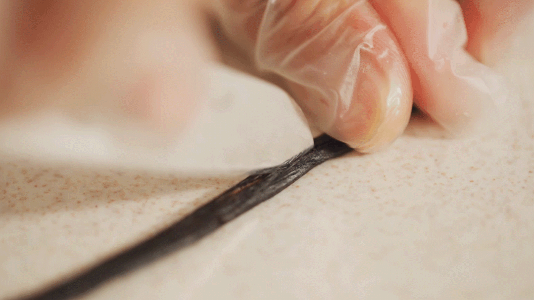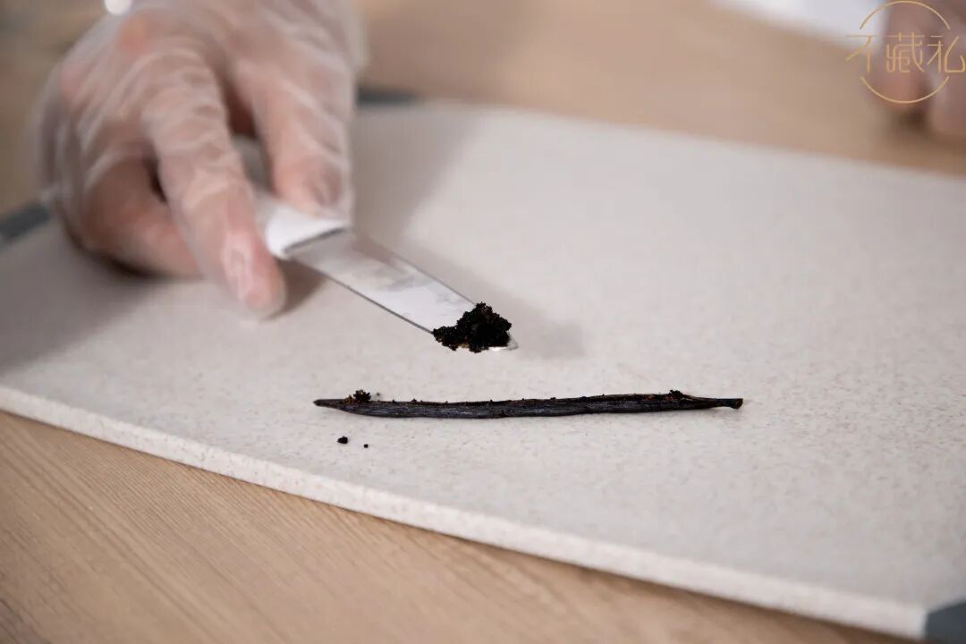 在使用的时候,先用小刀从中间切开,再用刀背把香草籽取出。