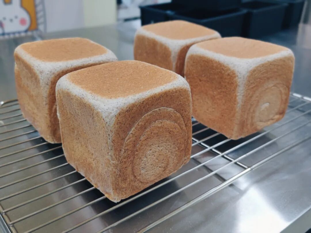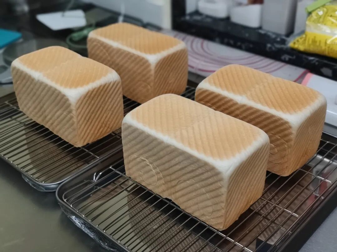 面团重量、发酵程度都恰当的情况下,烘烤时,面团应该膨胀至均匀充满整个模具,但又不会挤进四个棱边中,烤出来自然就形成漂亮的圆角白边了。