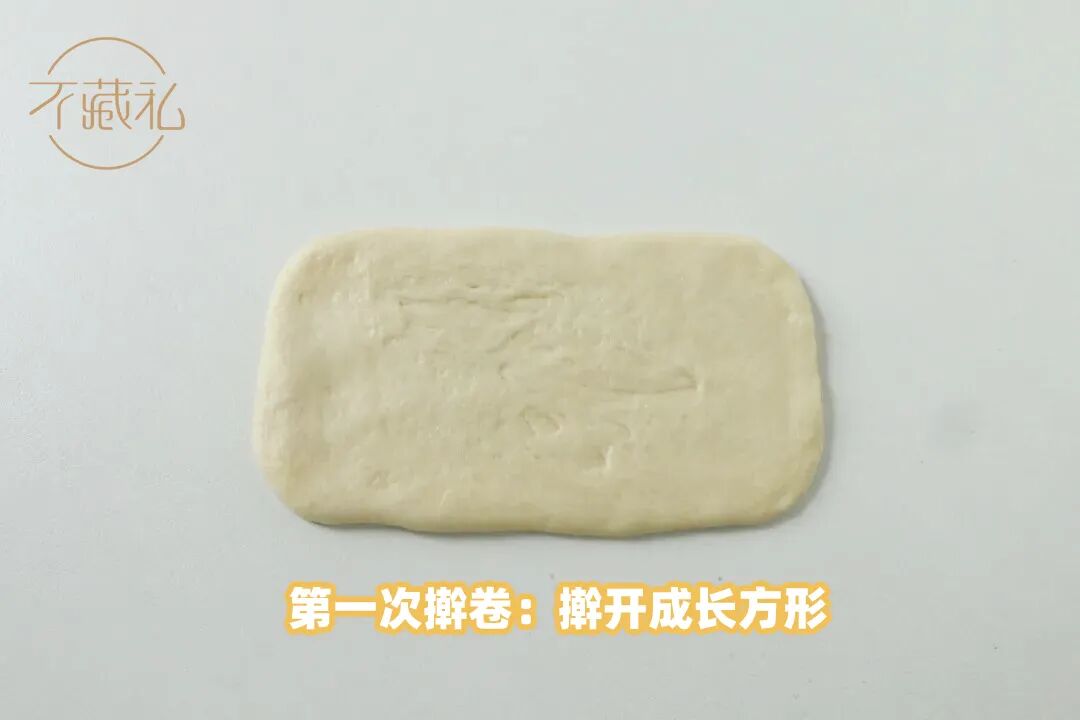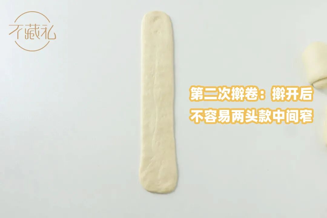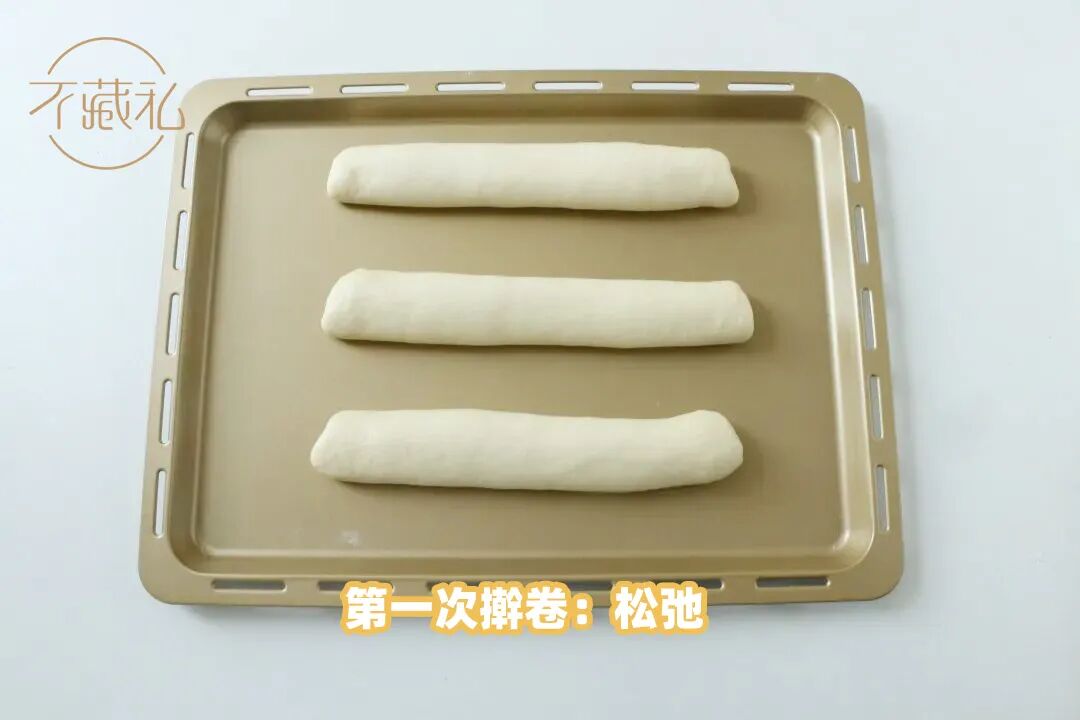 做擀卷造型,小布的建议是:擀卷2次,每次间隔10到15分钟。第一次擀卷翻面尽量擀成长方形,这样到第二次擀卷,就不容易出现两头宽中间窄的情况。