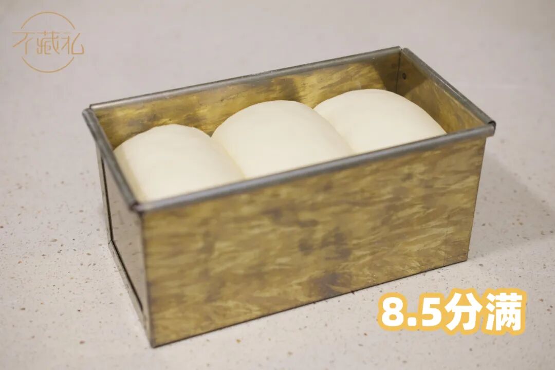 为了防止吐司过度膨胀(入炉烘烤后,面团中心温在60℃内,它都会一直膨胀),最终发酵的时候要给面团预留一部分烘烤膨胀的空间。发酵至8分满是一个分界线,超过8分,到达了9分甚至更高,吐司就会膨胀过度,挤出直角边。