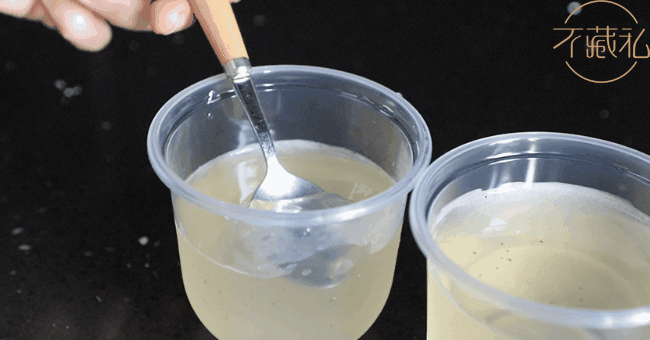 网上还有人用电动打蛋器来搅拌冰粉籽,感觉比手搓更省事,我们也用等量食材试了一下。