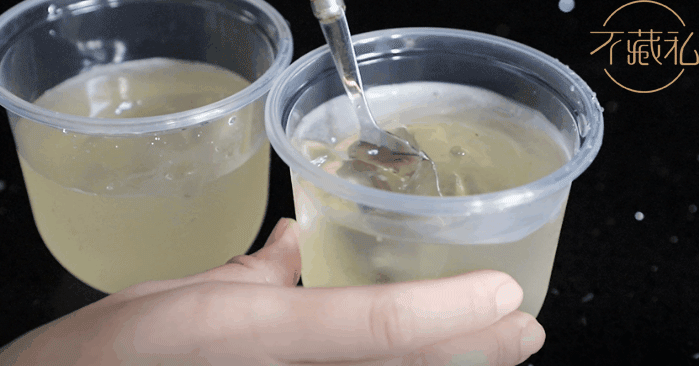 爱玉使用的是爱玉籽,搓出浆液后静置就会自然凝固。