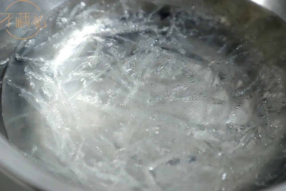条状琼脂先用常温水中泡半小时,然后放入水中加热煮沸,一直搅拌直至溶解。