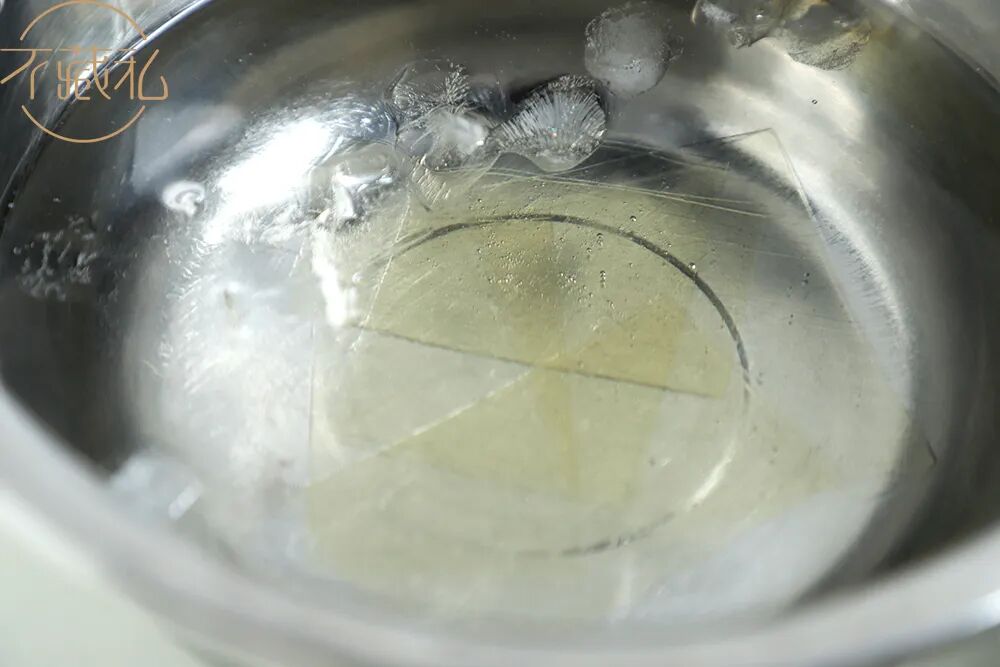 吉利丁片要先放在冰的饮用水里泡软(吉丁粉则先加入5-6倍的冰饮用水,搅拌均匀)。
