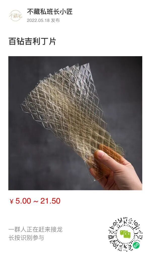 它又叫明胶片/粉,一般都是动物的骨头或皮肤提炼出来的,像是猪、牛、鱼类等等,其主要成分是动物性蛋白质。有粉状和片状两种状态,粉状吉利丁在港式食品里又叫“啫喱粉”。