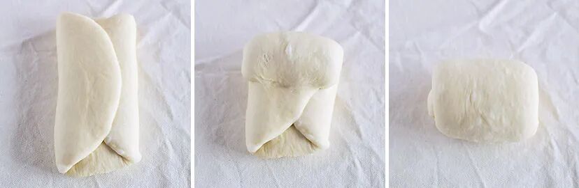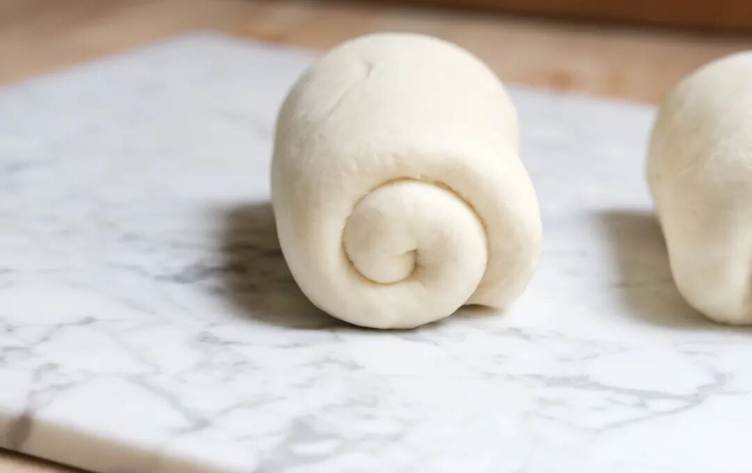 取一个松弛好的面团,拍平后三折成长条形,擀长后卷起,捏紧收口(一次擀卷的整形方式)。