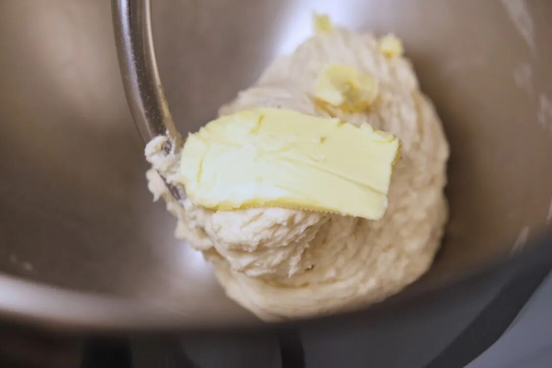 加入黄油,慢速搅拌5分钟后,转快速,搅拌至能够拉出透光薄膜,大约需要3-5分钟(根据实际情况调整时间)。