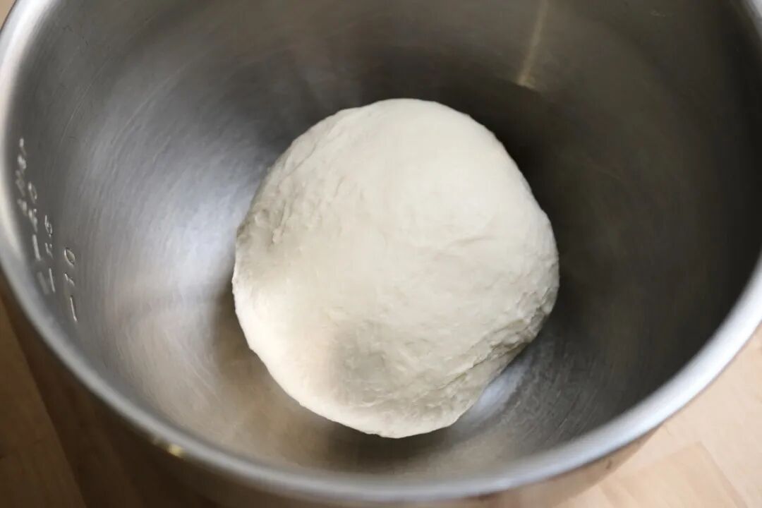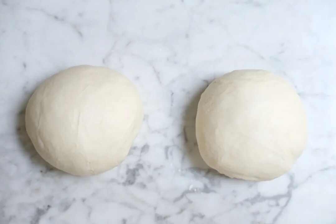 取出面团,排气,分割成2份(每份约231g),揉成球状,室温松弛20分钟。