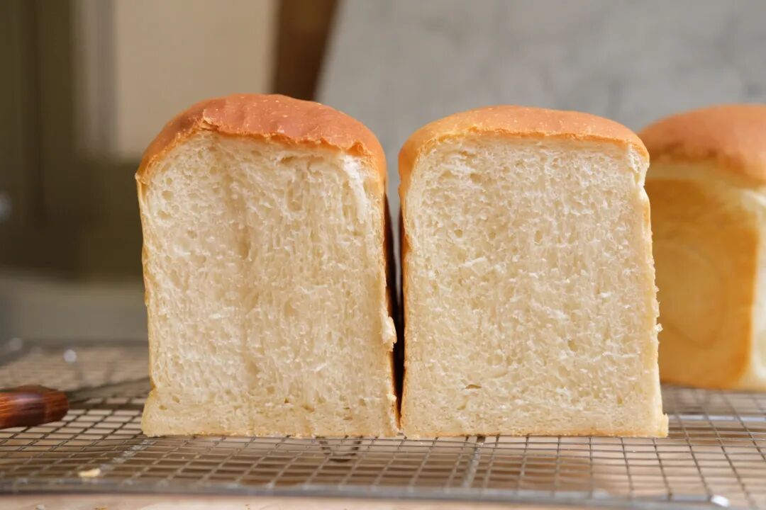再看吐司成品,使用了巴氏奶的吐司高度略低一些,但是对比来看,差别不大。