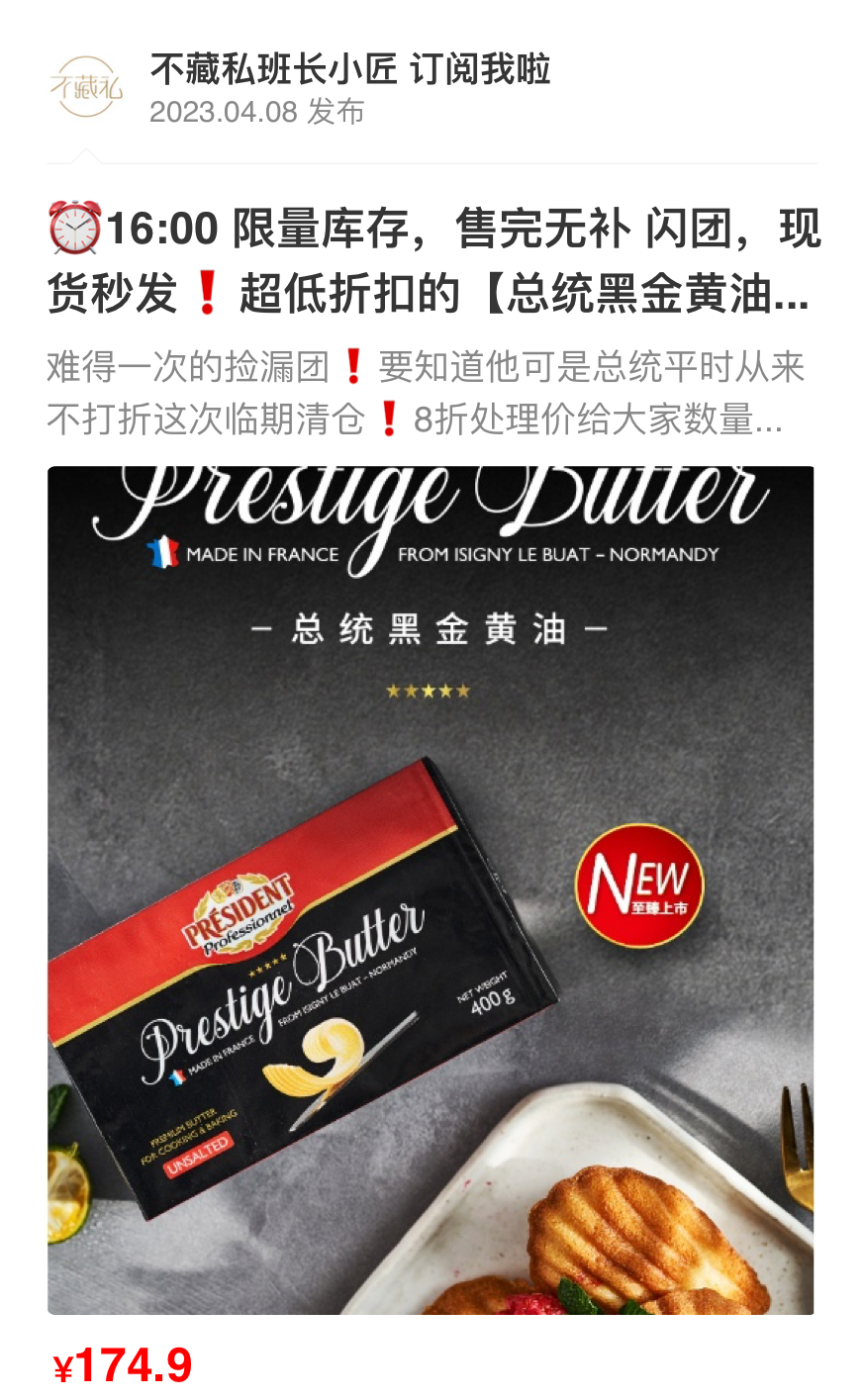 大家做面包越来越频繁的日子,可以适当囤点材料哦。最近咱们也挖到一些限时特价,像新良面粉大师系列,99元有6包!总统的黑金黄油折后均下来35元/块(400g)!都是拼手速的时候啦!戳下方图片立即开抢👇