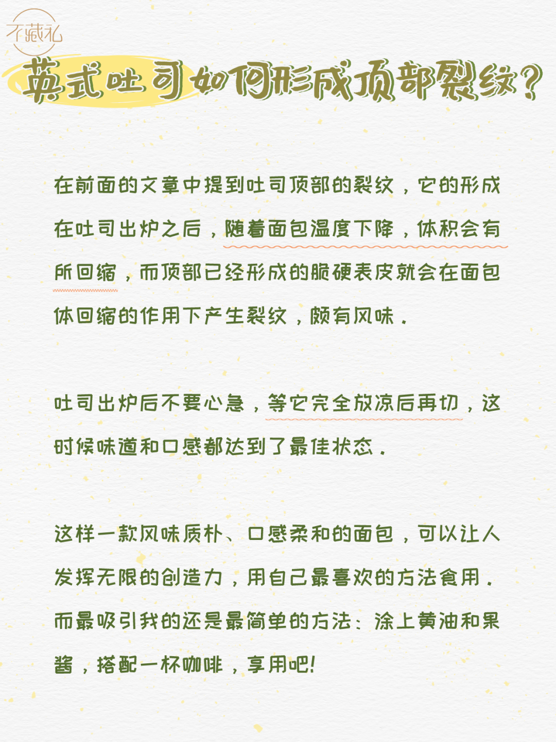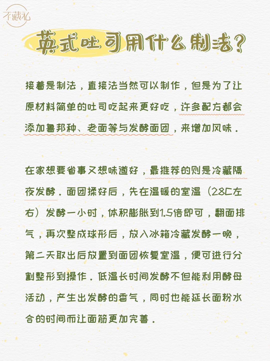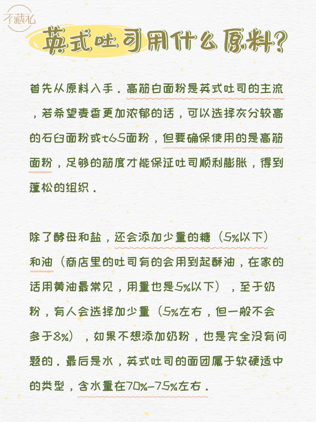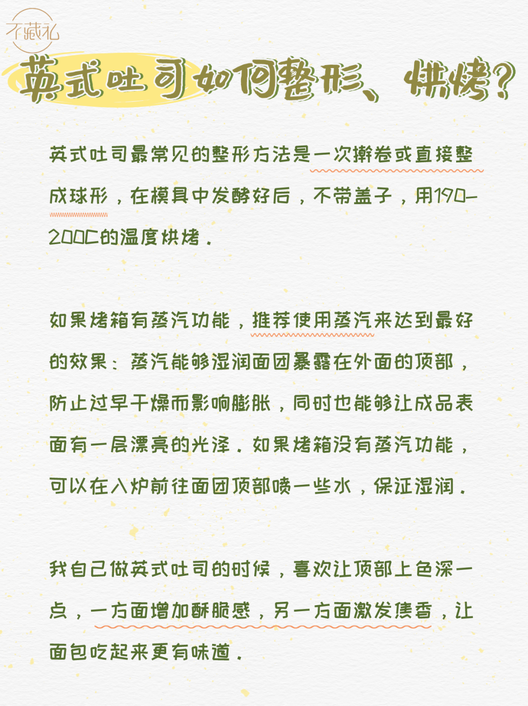 英式吐司的配方并不唯一,做法也稍有不同,在这里我们不挑战给出一个完美的配方,但想跟大家讲讲英式吐司的一些共同要点。