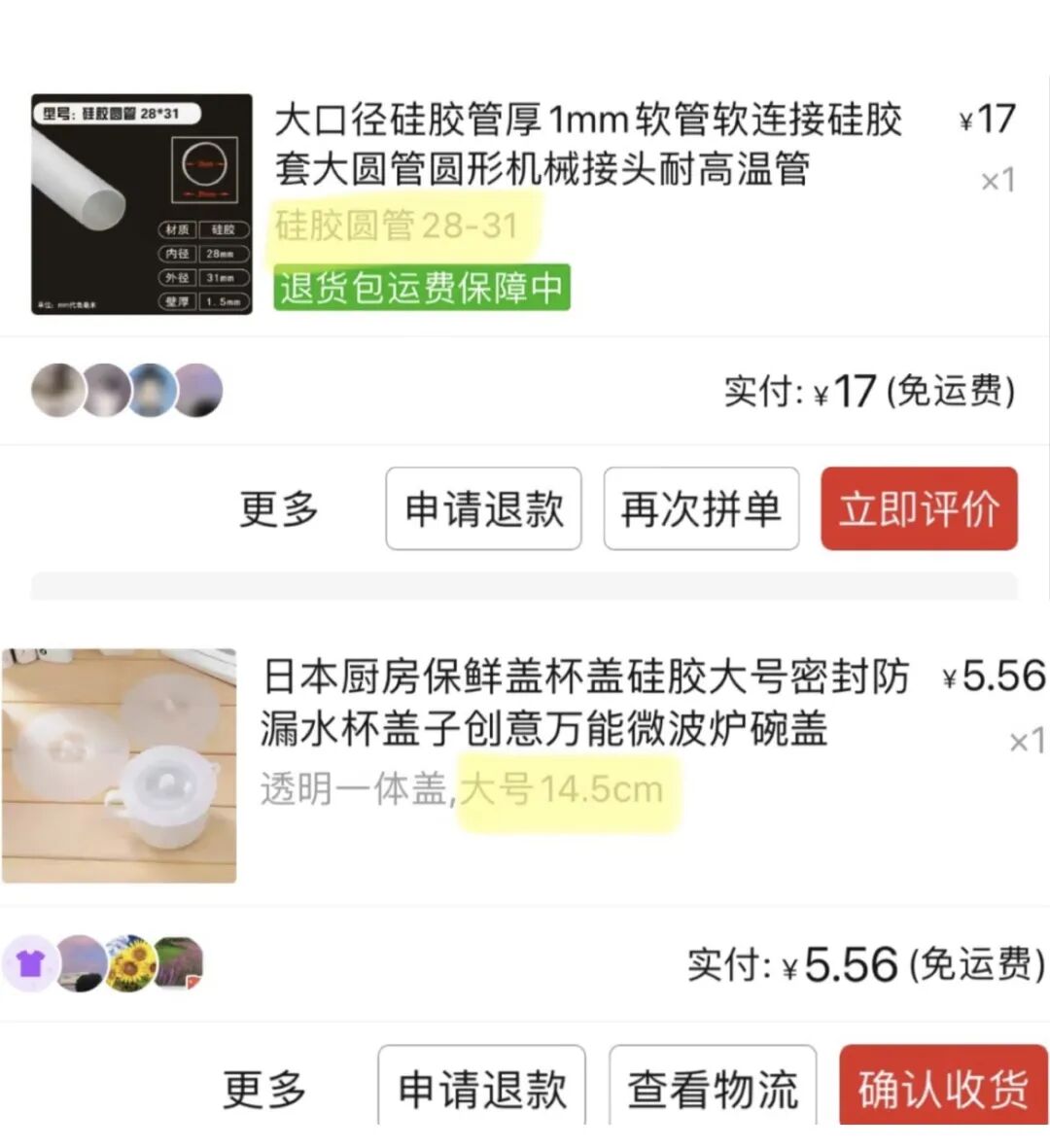 “这里教大家一个很容易方法,看图有写,最后一张图是买的硅胶管和硅胶杯套的尺寸,大家可以自行去搜索一下。”