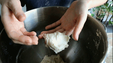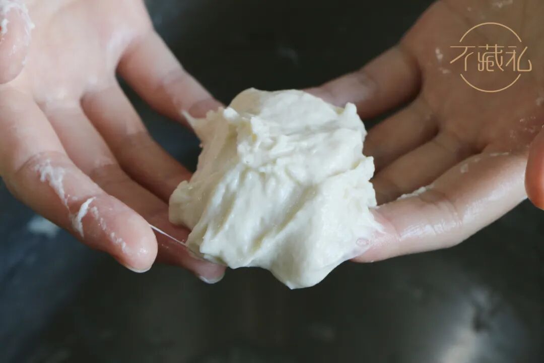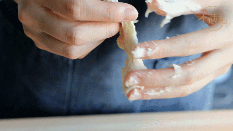 6.触摸面团,有弹性、光滑不粘,能轻松拉出大片的光滑薄膜,这是成功的面团。