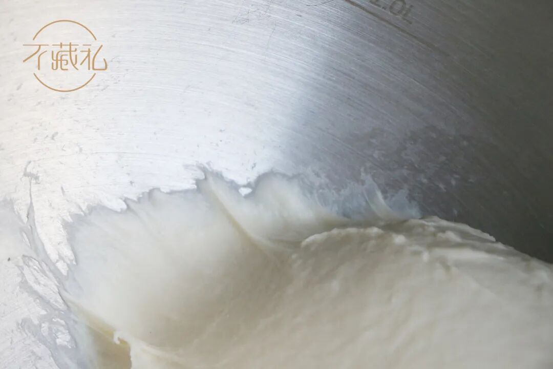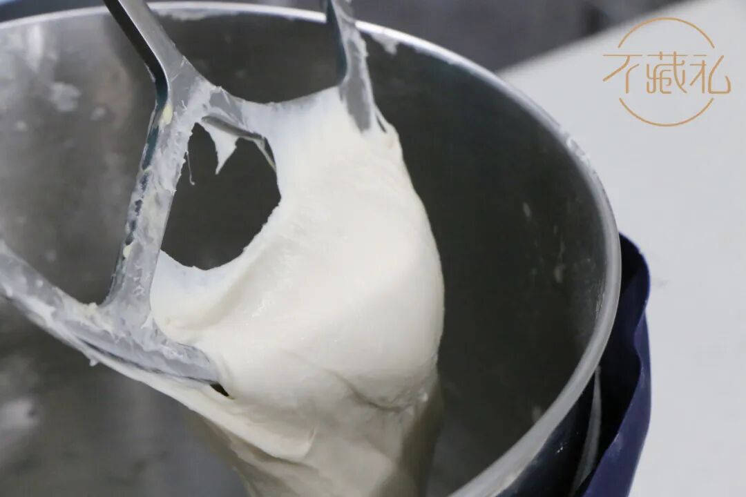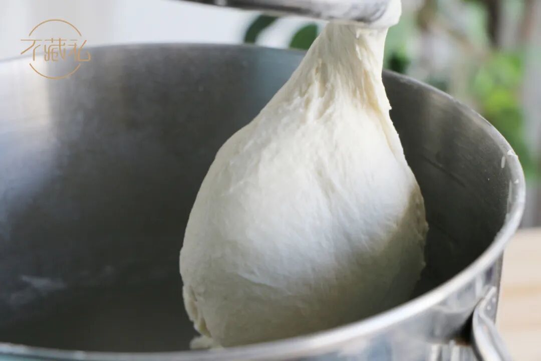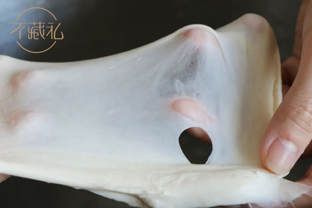8.能拉出非常漂亮的光滑薄膜。大水量的面团,面筋可以打得稍微没有那么足,9成筋就足够了。因为含水量越高的面团,出面筋更容易,二是发酵阶段,也是面筋继续形成的阶段。