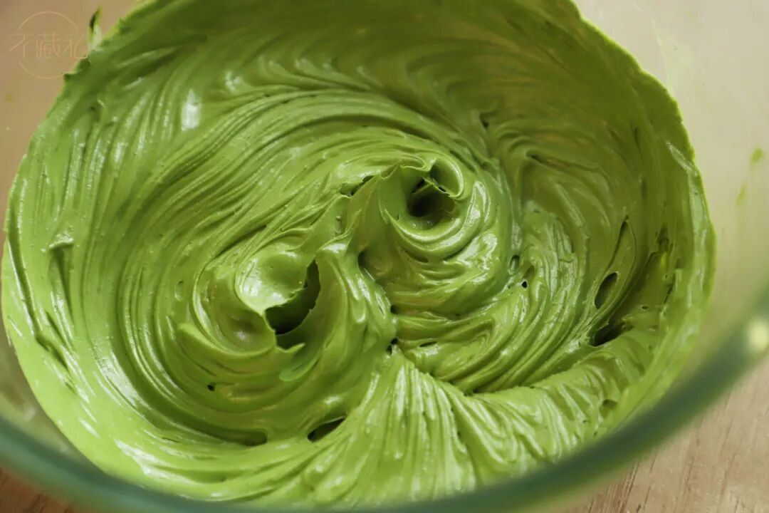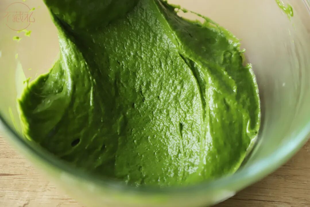 未加入蛋白前的面糊,看不到有抹茶颗粒。它的吸水性,我感觉比青岚、五十铃还要厉害。根据面糊的状态,我比惯用的配方多加了10g牛奶进去搅拌。