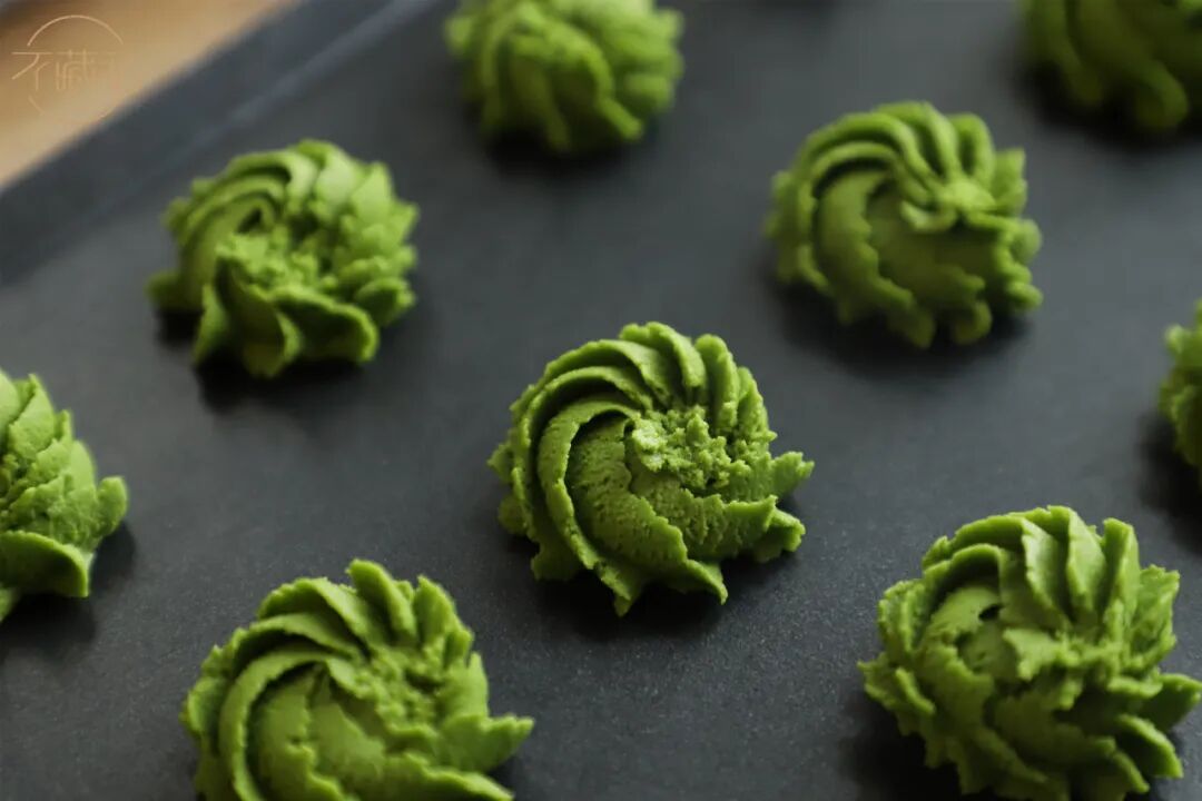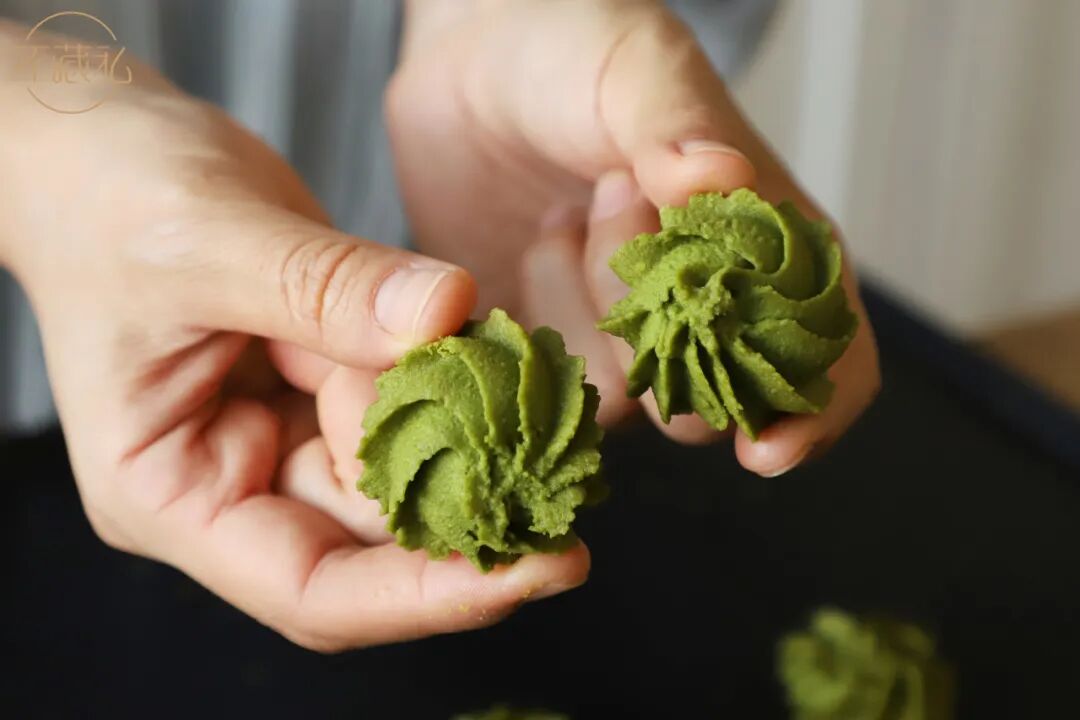 同样地由于油溶性原理,制作曲奇时,我也先把黄油与抹茶先放在一起打发,再加入后续的食材。做法是:把黄油稍微打发后,加入抹茶粉,继续充分打发。