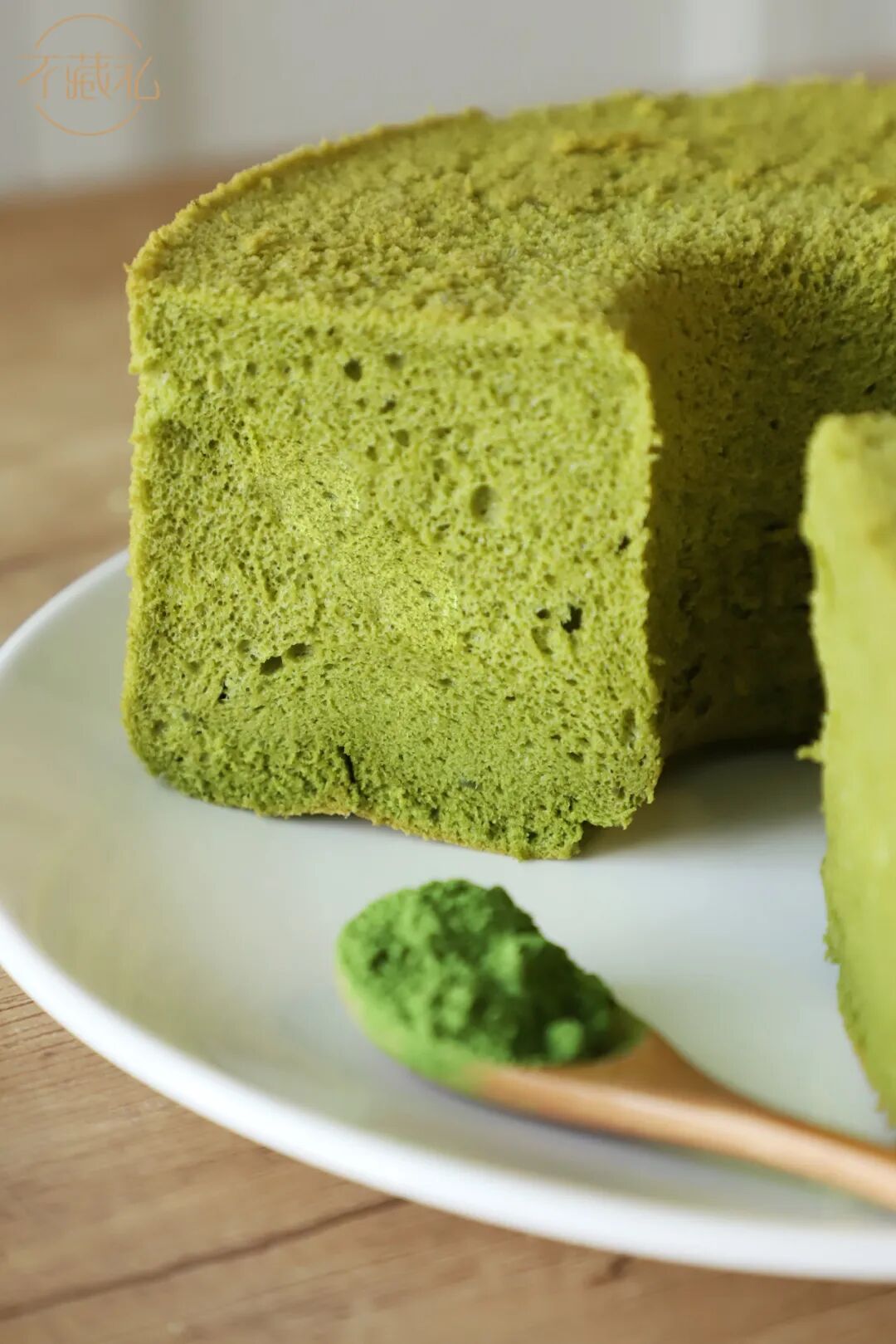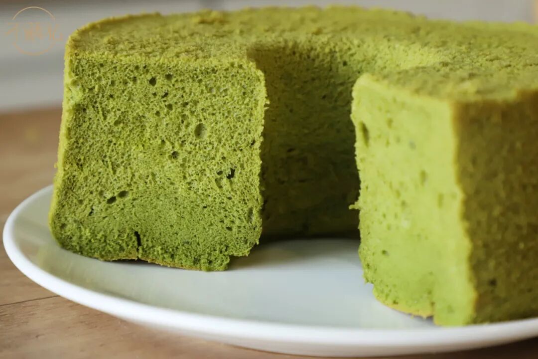 成品经过高温烘烤后,与生面糊相比,蛋糕的翠绿度能保持75%以上。戚风蛋糕本身是一款甜度适中的蛋糕,所以知止抹茶粉本身的茶涩味,大部分被中和了,入口味道温和,带着茶香。