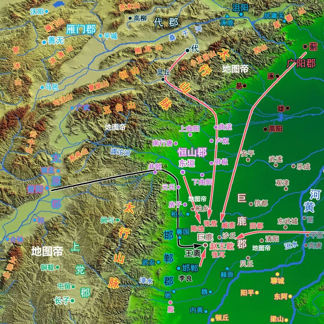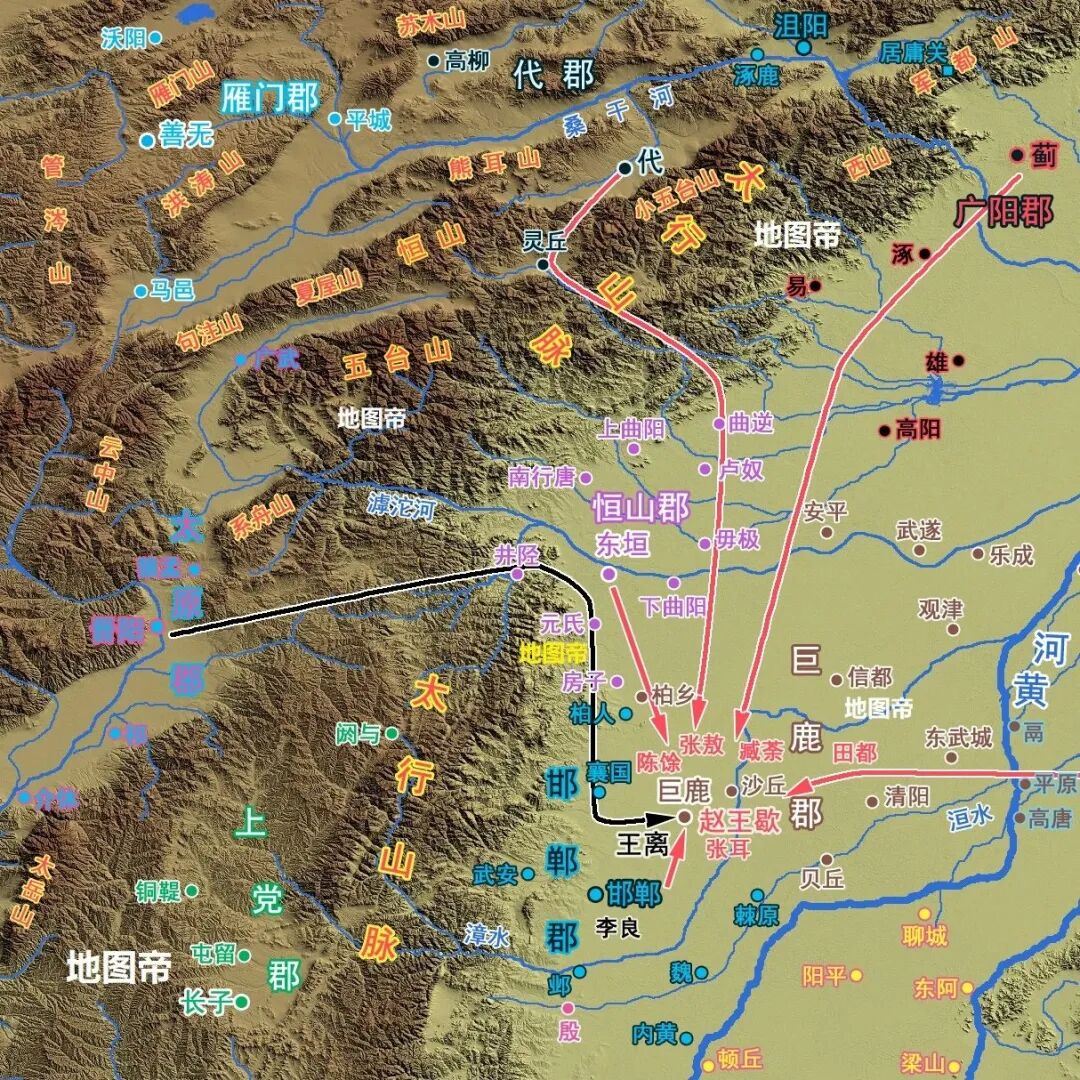 秦上将军王离围困赵国巨鹿城,城中兵少粮尽,万分危急。赵王歇令大将军陈馀北上常山郡募兵,又派张耳之子张敖去代郡募兵。王离招降李良,不费一兵一卒,只凭李良的兵马就控制邯郸,又令偏师登上太行山,把赵将张黡的军队赶下山,占据上党郡。