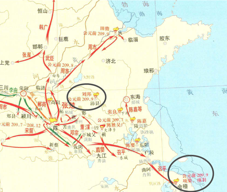 与此同时,沛县的刘邦也拉着同乡的兄弟伙伴们开始了自己的革命道路。