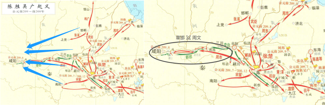 从部署的行军路线来看,很明显,这是计划兵分多路,义军在向西进军的同时,沿途再捣毁和占领秦势力的重要郡县,最后多路军队聚集到帝国的心脏咸阳,给予暴秦最后的打击,颠覆王朝的政权。