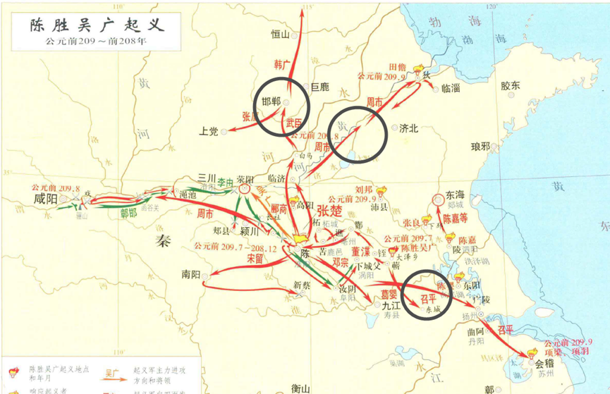 从秦灭楚再到大泽乡起义前后不过14年的时间,陈作为历史悠久且具有政治属性的要塞,这里不仅有四通八达的交通,囤积着较充裕的粮食、兵器。最重要的,这里人口基数较大,作为故地这里隐藏着曾经关东六国的政治人物。