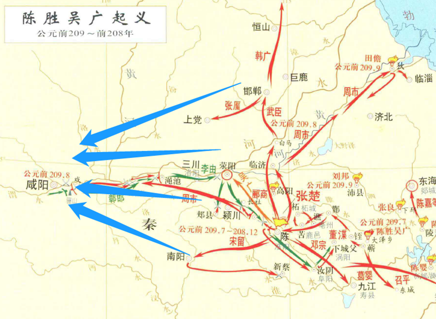 我们知道,秦都咸阳在陈郡的西边,所以向西挺进的部队是反秦的主力。