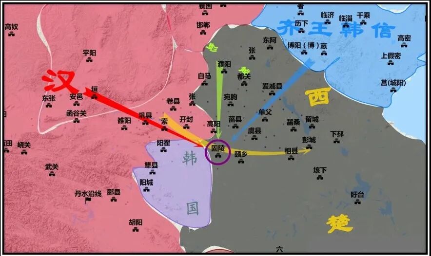 随着政令的颁布,韩信与彭越立即率兵跟进。此时东进的汉军集团已经将楚军彻底包围。