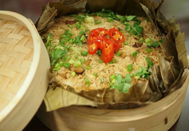 荷叶制作菜肴在汉唐时就开始盛行了,中医记载,荷叶与饭共煮,有生发元气、调理脾胃、清热解暑的功效。 唐代文学家柳宗元在《柳州峒岷》一诗中提到“绿荷包饭趁墟入”,“绿荷包饭”至今仍是广州和福州茶楼的传统美食。