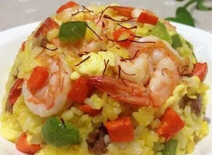 藏红花用水泡好备用,鸡蛋加少许水打散,虾仁剥壳清洗干净,瘦肉,洋葱,青椒,胡萝卜切粒,锅里放入少量的油,倒入虾仁,炒到半熟倒出备用,锅内倒油倒入胡萝卜翻炒,再放入肉粒煸炒一会儿,加入青椒和洋葱,加入盐翻炒均匀,再倒入米饭,把饭块打散均匀,再倒入泡好的藏红花水翻炒一下,最后倒入炒好的鸡蛋和虾仁,继续翻炒一会儿,加入味精或者鸡精即可。
