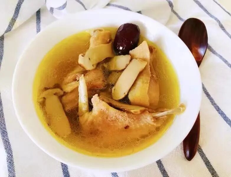 将松茸清洗干净后切片,鸡放入沸水冲焯一下取出切块,锅内倒入少许油,下入生姜片和鸡块煸炒至鸡皮收紧,倒入适量开水,放入红枣中火炖一小时后,加入松茸转小火继续炖一小时,加入适量食盐即可。