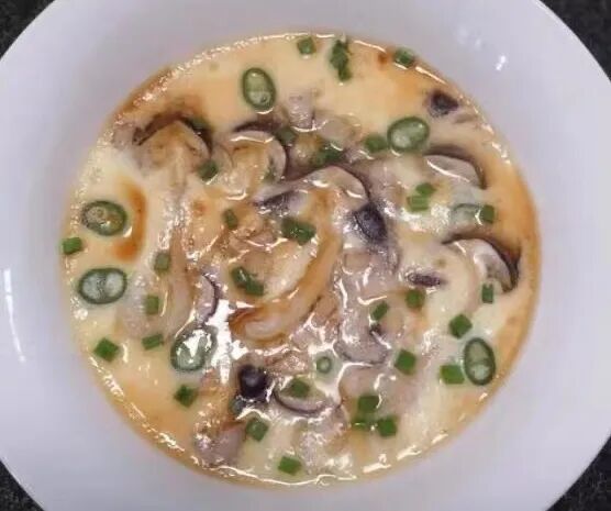 松茸清洗干净后切成小条,鸡蛋打散后缓缓加入温开水,水量与蛋液比例为2:1,再加松茸丁,放入少量的盐和味精,轻轻搅拌均匀,封上保鲜膜,隔水先大火蒸1分钟,再小火蒸12分钟,撒上葱花即可。