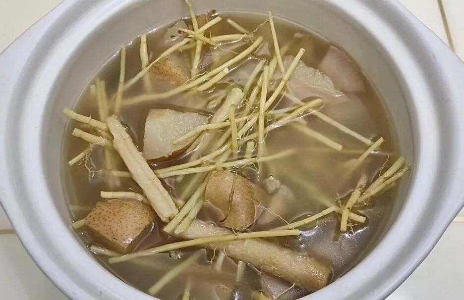做法:鲜白茅根100g,雪梨1个,竹蔗100g。