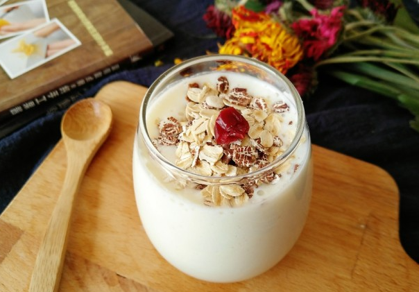 将山药泥、牛奶、糖和燕麦片搅拌均匀,直至成为奶昔状。