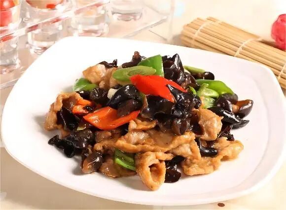 黑木耳烫水后切片,炒香葱姜蒜和干辣椒,加入肉片翻炒至变色。