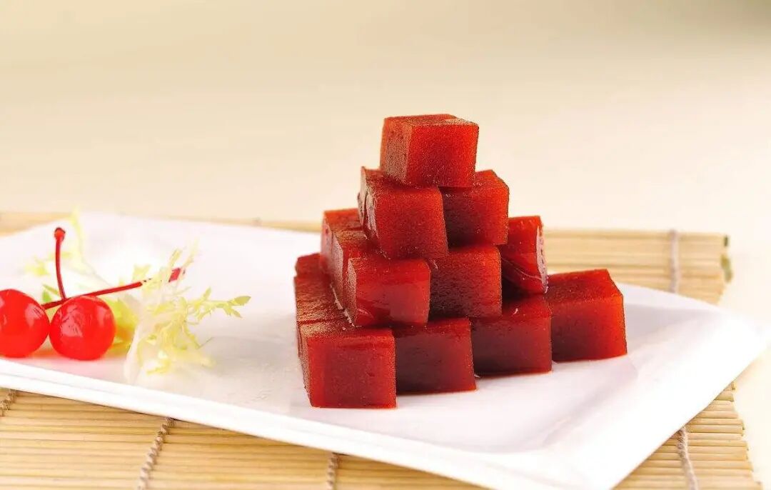 制作山楂棒糕,将其冷藏成型后切块备用。