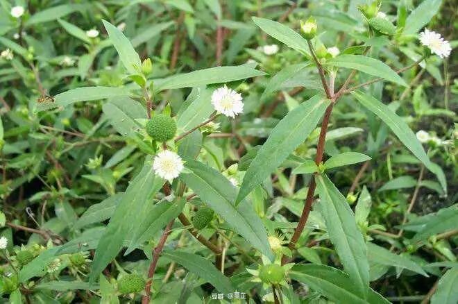 【生境分布】一年生草本,高20-60厘米。生于田边、水沟、屋旁阴湿处。全株有粗毛。茎直立或平伏,多分枝,茎节着地生根。叶对生,叶片披针形,边缘常有细锯齿,无柄。折断茎叶即流出液汁,数分钟后即变成蓝黑色,头状花小,色白,生于叶腋或枝顶。瘦果黑色。全草干燥后呈黑色,故称墨旱莲”。全草入药,夏秋采收,鲜用或晒干。