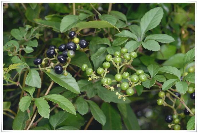 【生境分布】多年生攀援藤本,长达3米左右。生于低山灌木从中。地下茎蔓延。茎有纵棱,有2分叉的卷须,被微柔毛。叶互生,膜质,五出掌状复叶,小叶倒卵状矩圆形,先端短尖或钝,基部近圆形,边缘有粗锯齿,叶柄长。夏开绿色小花,聚伞花序。浆果球形,成熟后黑色。夏秋采全草,鲜用或切段晒十。