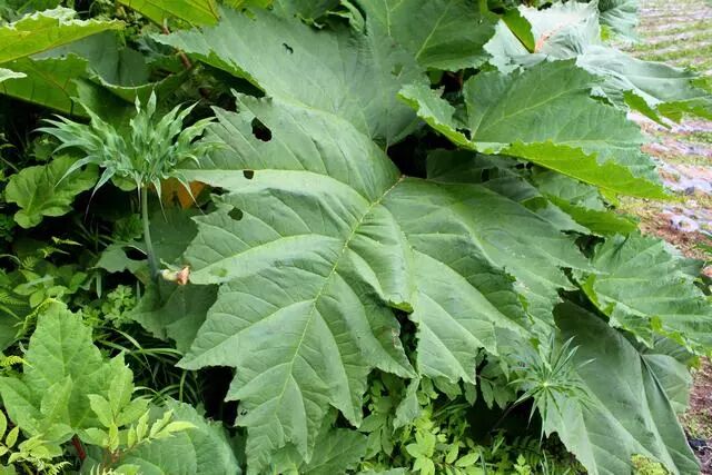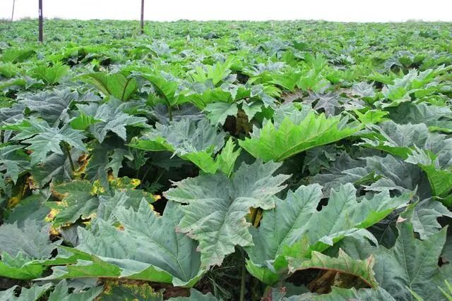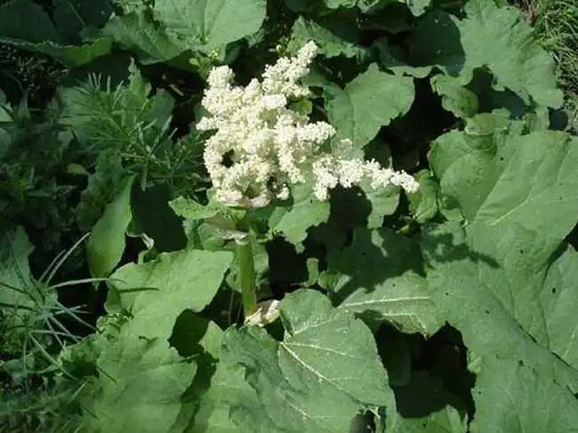 【生境分布】多年生草本,高达2米。生于林下阴湿处。肉质根及根状茎粗壮。茎中室绿色,平滑无毛,有纵纹。单叶互生;具粗壮长柄,柄上生白色短刺毛;基生叶圆形或卵圆形,长宽均达35厘米,掌状5~7深裂,裂片矩圆形,边缘有尖裂齿,叶面生白色短刺毛;茎生叶较小(南大黄基生叶5浅裂;鸡爪大黄叶裂极深,裂片狭长)。秋季开淡黄白色花,大圆锥花序顶生;花被6裂,雄蕊9个。瘦果矩卵圆形,有3棱,沿棱生翅,翅边缘半透明。根及根状茎入药。秋末冬初采收,去粗皮,切片干燥备用。
