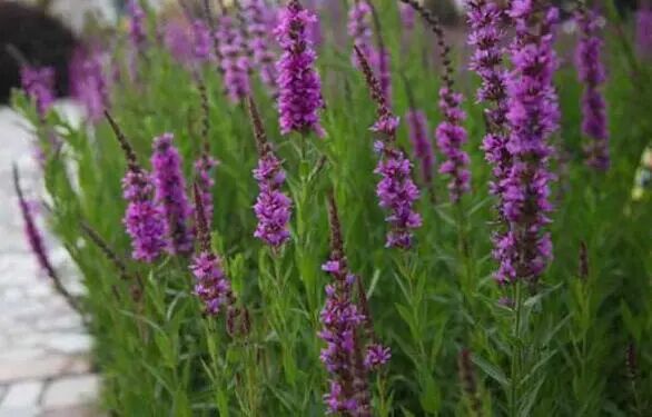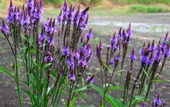 形态特征:多年生草本植物,茎细长,方形叶对生,细裂成羽状。春末至秋季开淡紫蓝色小花,集成穗状花序,形似马鞭,故称马鞭草