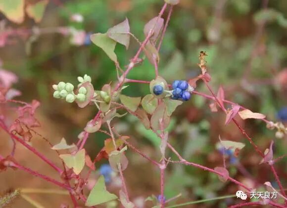 【生境分布】多年生蔓性草本,长2~3米。生于田坎、沟边及山脚灌丛中。茎细长,四棱形,棱上有倒生的钩状刺,基部木质化,有时带红色。单叶互生,有长柄,柄上亦密生倒钩刺;叶片盾状三角形:托叶圆形,抱茎。花白色或淡红紫色,短穗状花序顶生或腋生。瘦果球形,坚硬,有光泽,成熟时蓝色。全草入药,夏、秋采集,鲜用或切断晒干。全国各地均有分布。