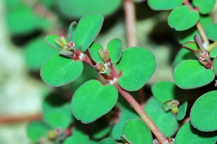 【生境分布】一年生小草本。生于庭院、菜园、路旁。茎纤细,平铺地面,从根部分为数枝,带紫红色。叶对生,有短柄;叶片椭圆形,长4-12毫米,先端钝圆,基部斜,两侧不等大,边缘有细齿。折断茎叶有乳白色汁流出。叶腋开花杯状聚伞花序,紫红色。蒴果三棱状球形。夏秋采全草,鲜用或晒干
