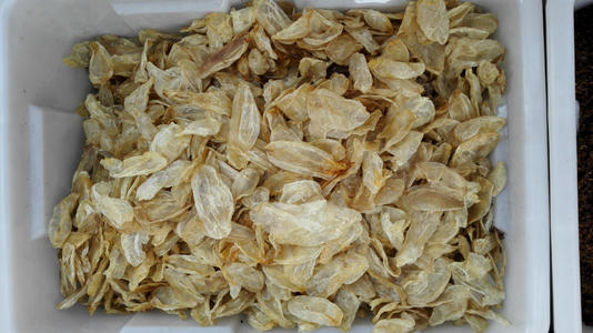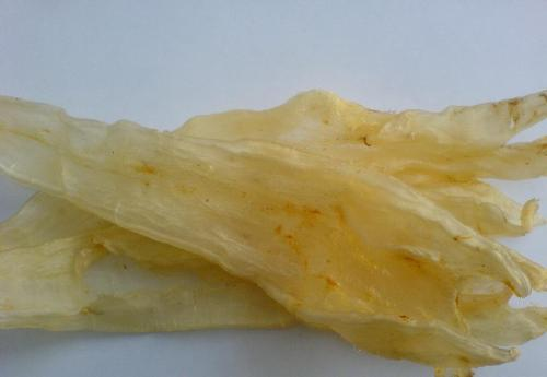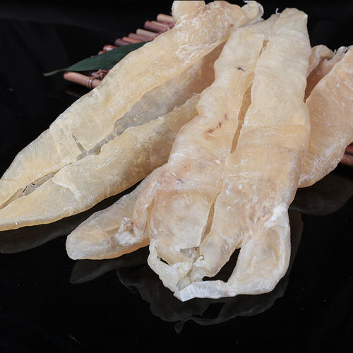 鱼鳔,为石首鱼科动物大黄鱼、小黄鱼或鲟科动物中华鲟、鳇鱼等的鱼鳔。干燥的鳔多压制成长圆形的薄片,淡黄色,角质状,略有光泽。黄鱼的鳔较小,鲟鱼及蝗鱼的鳔大,并附有垂带2条。质坚韧,不易撕裂,裂断处呈纤维性;入水易膨胀,煮沸则几乎全溶,浓厚的溶液冷却后凝成冻胶,粘性很强。气微腥,味淡。商品统称为鱼肚。鲟鱼、鳇鱼的鳔称为黄唇肚或黄鲟胶。有切成线条的称为线鱼胶。